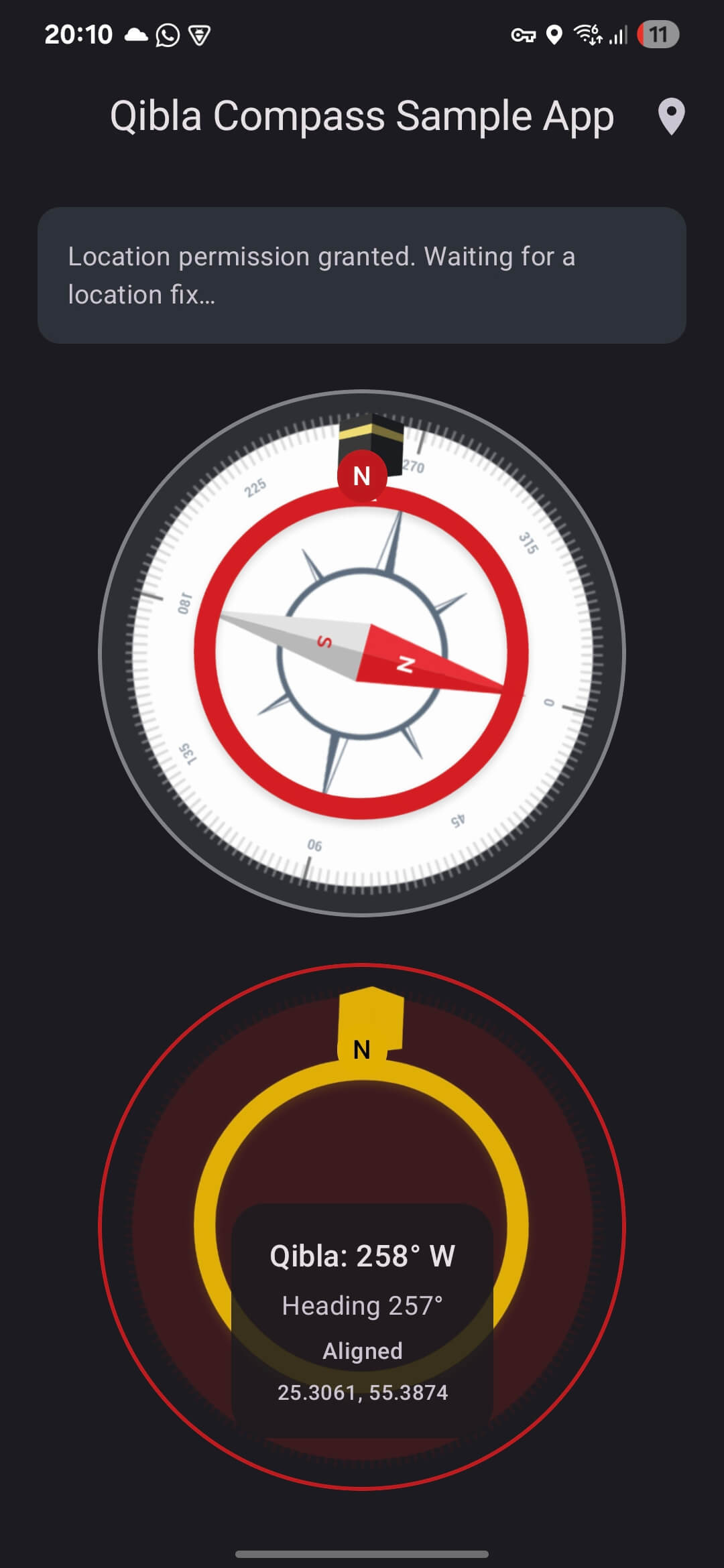 Modern Android library that renders a customizable Qibla compass using Kotlin and Jetpack Compose. It provides lifecycle-aware sensor and location helpers together with a ready-to-use compass composable that you can drop into your app.